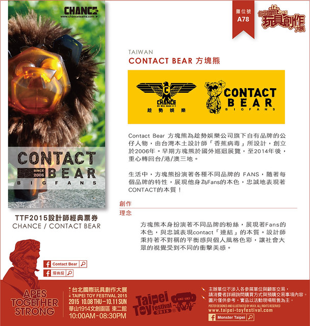 Contact Bear方塊熊為趁勢娛樂公司旗下自有品牌的公仔人物,由台灣本土設計師「香蕉病毒」所設計,創立於2006年。早期方塊熊於國外巡迴展覽,至2014年後,重心轉回台/港/澳三地。 生活中,方塊熊扮演著各種不同品牌的FANS,隨著每個品牌的特性,展現身他為Fans的本色,忠誠地表現著CONTACT的本質!