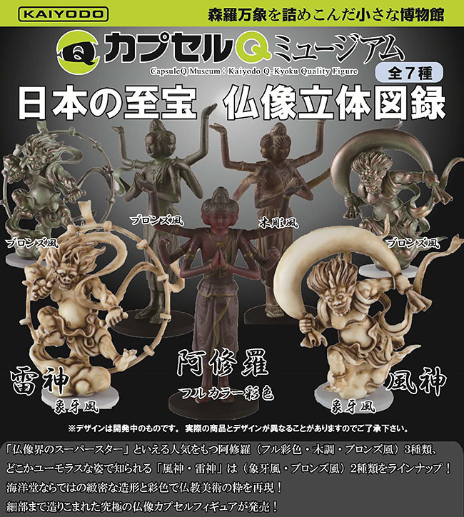 膠囊Q博物館這次的新作「日本的至寶 佛像立體圖錄」,將收錄了多款佛像界深受喜愛的人氣佛像! 其中最具有人氣的「阿修羅」將有全彩、木雕色與銅像色三種版本,而熱門的「人氣雙人組」-「風神 & 雷神」則將推出象牙色與銅像色,全部一共7種款式。精緻的造型、逼真的上色,不愧是號稱為博物館的轉蛋系列! 推薦給喜愛特別收藏的玩具人!:D