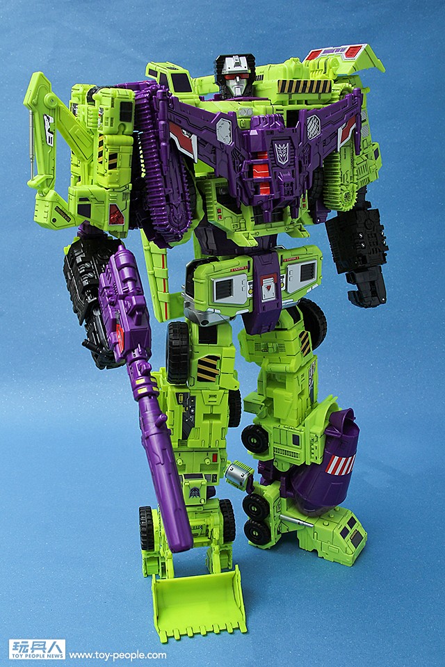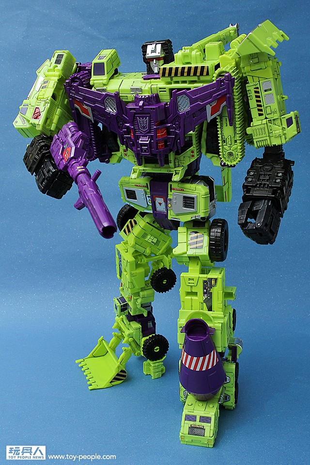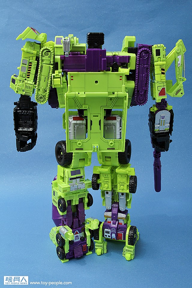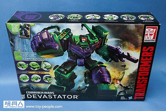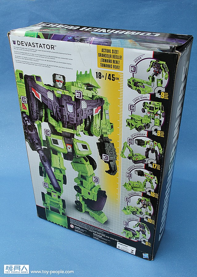 ▼ 再來看看盒子的背面,高達53公分的箱子中藏著45公分的超魄力巨神。同時也有六台工程金剛的變形示意圖。
