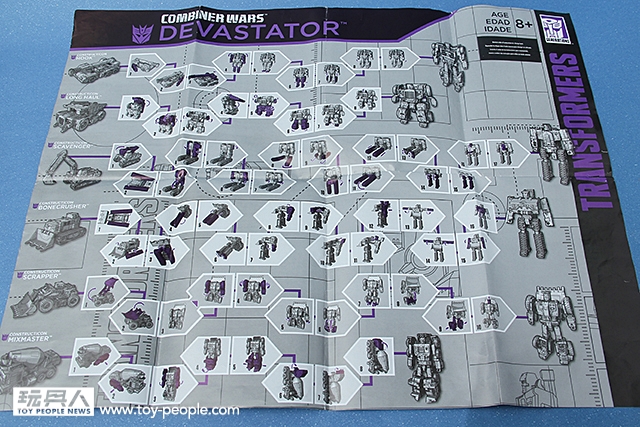 ▼ 如此多機體集於一身的大力神,說明書也是大SIZE,共有兩個部分,左上是每一個工程金剛的變形說明,至於左下跟右半部當然就是六神合一…,不~是大力神的合體指示,總共需要14個步驟。