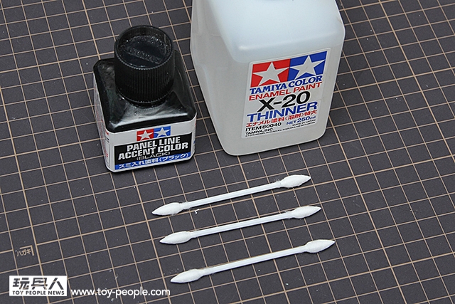 ▼ 這時候,就是田宮琺瑯漆溶劑X-20出場的時候。拿起棉花棒,沾取少許的X-20,並且用衛生紙巾把棉花棒吸到微乾的狀態。就可以對著畫出去的部分,直接擦掉。入墨線的程序就完成了。