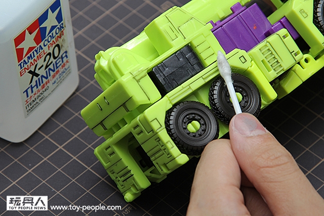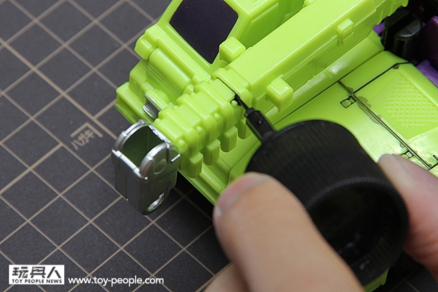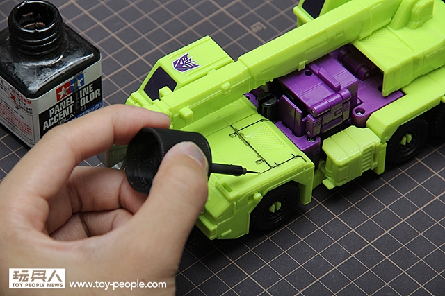 ▼ 入墨線的方式很簡單地~,過去,我們都要用琺瑯漆沾取溶劑稀釋後,在用畫筆去點,然後再擦…,手續之多,非常麻煩。但是,現在有了田宮琺瑯漆墨線液,只要鎖緊瓶蓋搖一搖後,就可以拿瓶蓋的筆刷,針對工程金剛身上的每一道機械線條,去入墨。光是點下去,你們就可以感覺到那份寫實的質感了…!