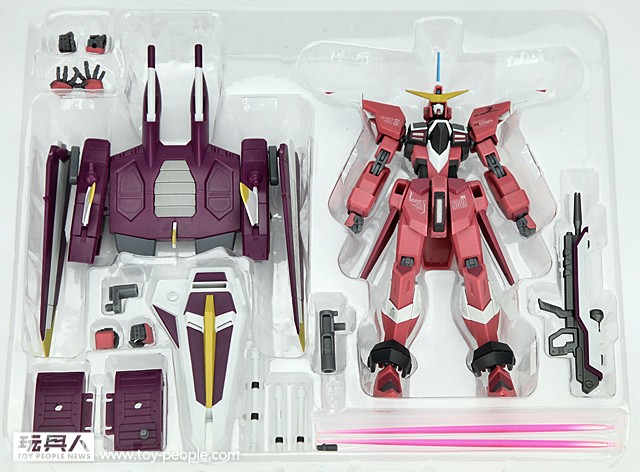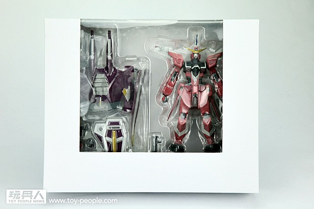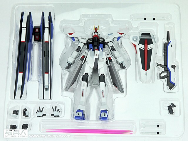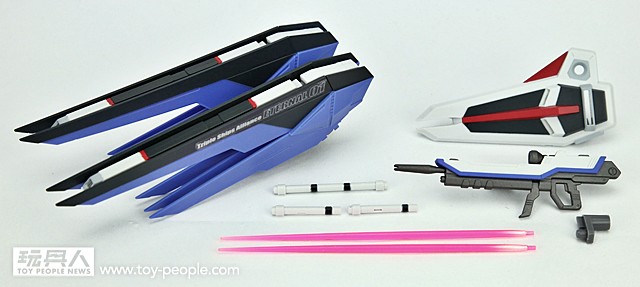 ▼ 內容物一覽。有別於「自由鋼彈」的可動空力彈性翼推進器,「正義鋼彈」的強力外掛載具「Fatum-00」(命運-00)!