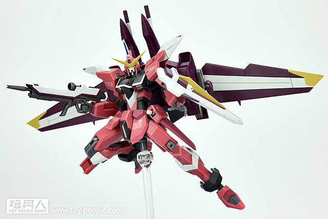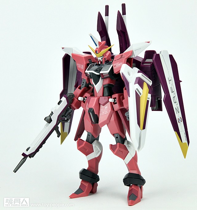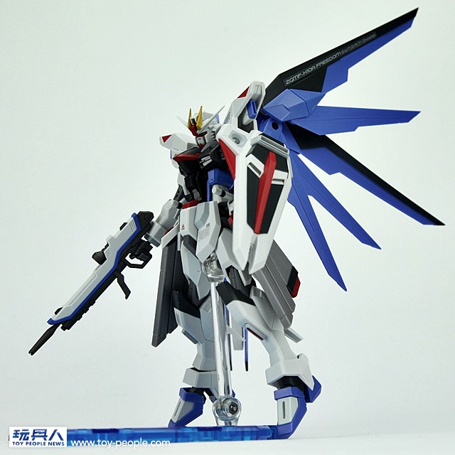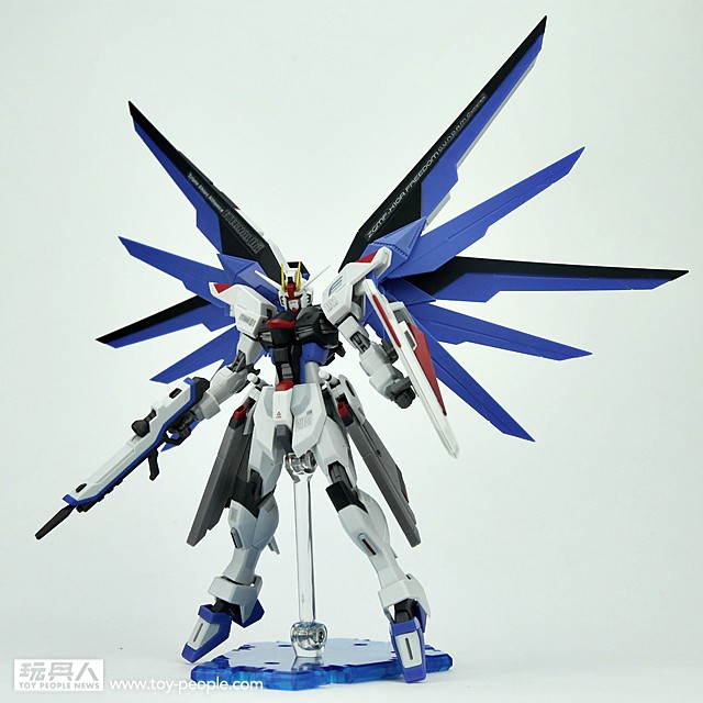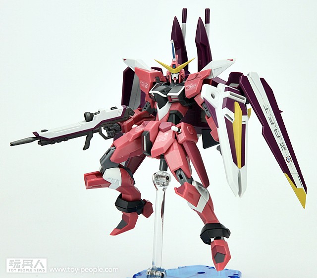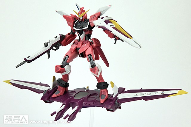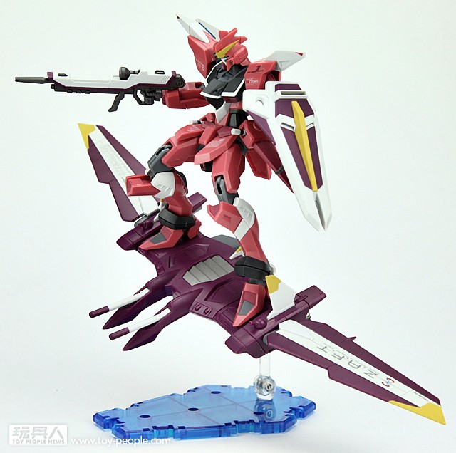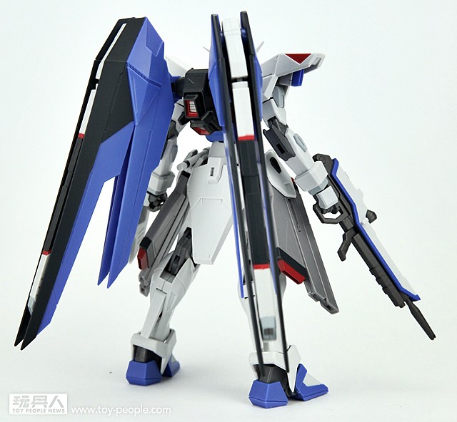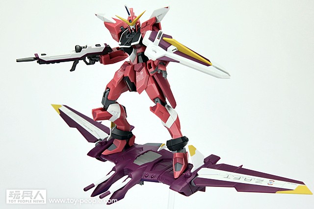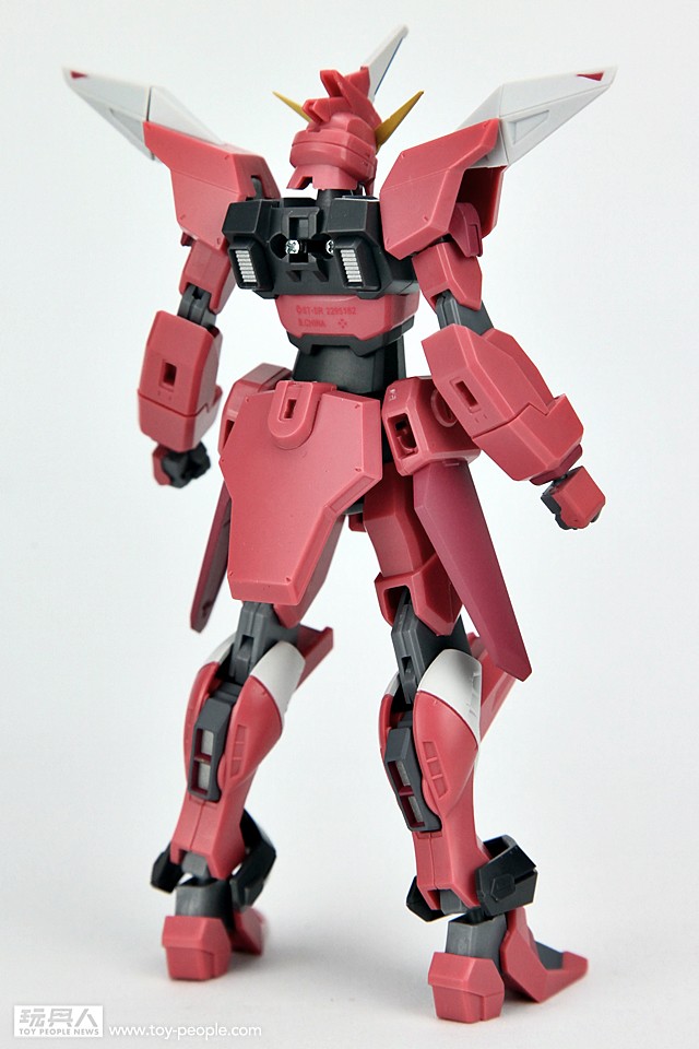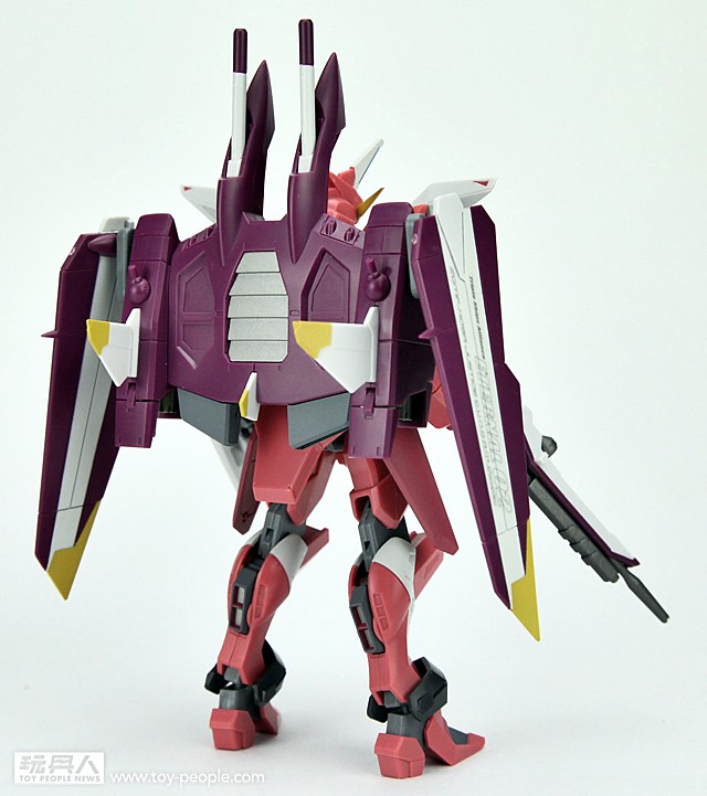 ▼ 裝備「Fatum-00」之後的背影看起來氣勢十足啊~ 相較於「自由鋼彈」推進器的重量調整,「正義鋼彈」裝備推進器之後姿勢比較容易失衡,不過不藉助支架還是能夠站的很好。
