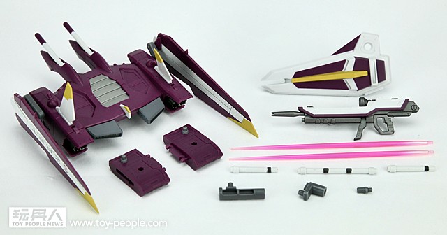 ▼ 配件一覽:可動空力彈性翼推進器、MA-M01「蜥式」光束軍刀(兩把)、雙頭戟模式光束軍刀刀柄、積層反光束防盾以及MA-M20「狼式」光束步槍。