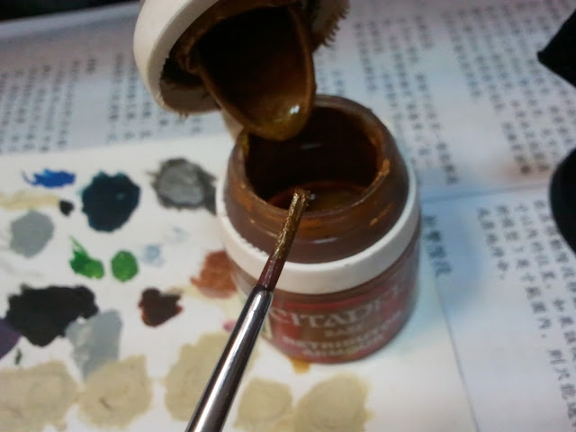 然後整個模型一次漬洗,要注意漬洗的時候不要有累積太多顏料的地方。