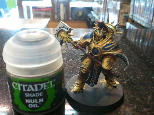 在使用Nuln Oil做漬洗之前紅色的頭頂冠毛跟手杖我用Khorne Red來製作。