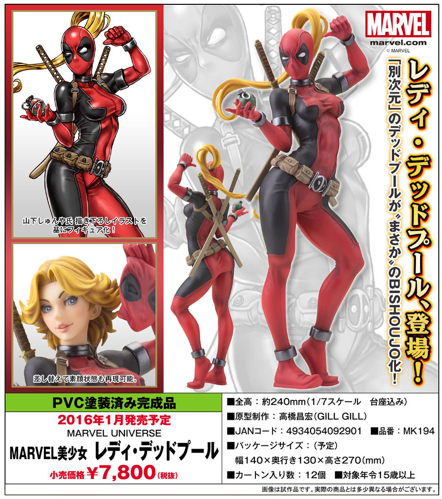 與知名插畫家山下俊也(山下しゅんや)合作,暢銷熱賣的壽屋各種美少女題材作品,最新作《MARVEL 美少女》系列,將推出超人氣的歡樂英雄「死侍」平行世界版本的『死侍小姐』(Lady Deadpool)!:D