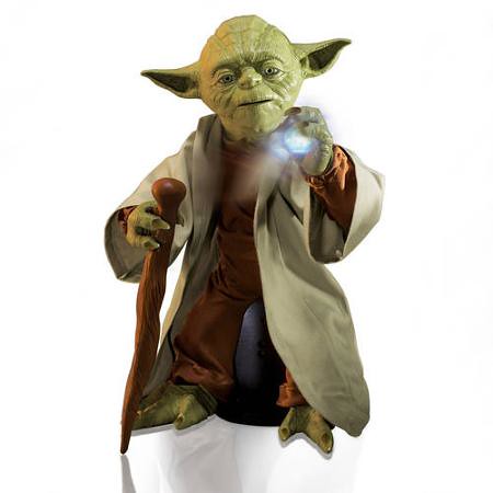 這次由Spin Master 所推出的作品,全高約16英吋(40.64公分),雖然不能行走,但他能夠360度轉動,並且使用他的手抓取光劍(或手杖),並且能夠說115種不同的台詞,甚至能夠辨識你的句子來做出回應。藉由三種不同的「原力」、「智慧」與「戰士」模式,尤達會呈現各種不同的姿態與台詞。 把他請回家裡,各位玩具人也有機會能夠參透大師的指導,領悟其8百多年智慧的深奧,學習成為絕地武士!