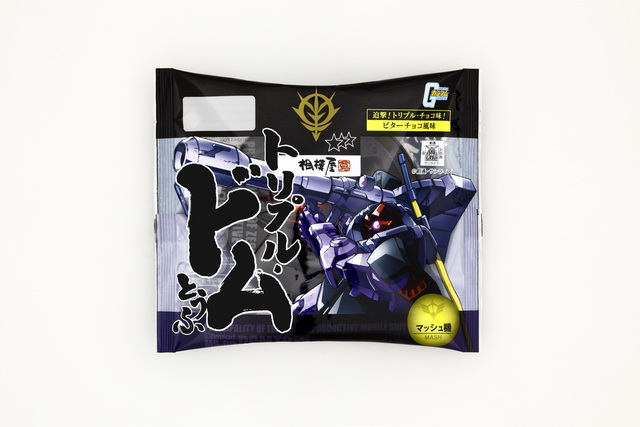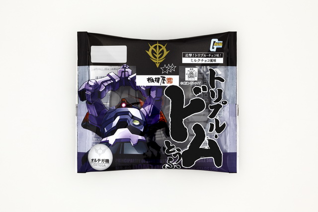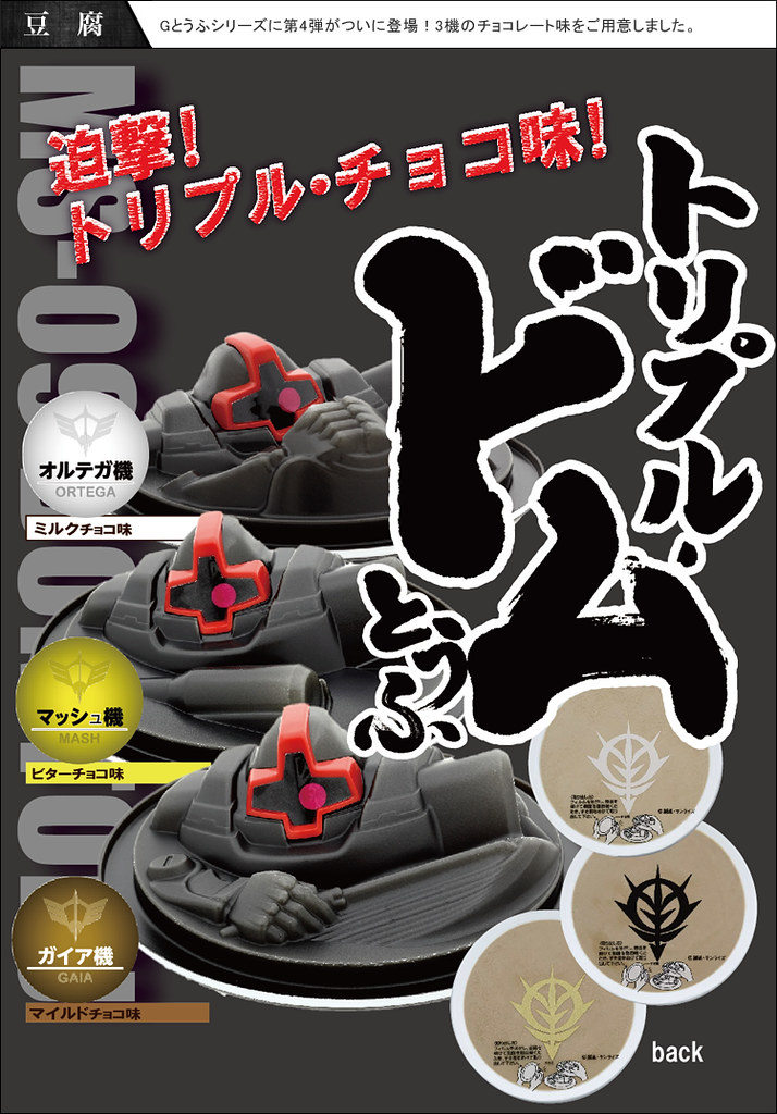 這次所推出的豆腐,是黑色三連星的必殺技「連續噴射氣流攻」為發想所設計,使用了濃厚的豆乳加上巧克力,製作出了溫和、微苦以及牛奶三種口味。並且依照系列作的慣例,倒扣出來之後,就能夠看到立體的「黑色三連星」造型,相當有趣!