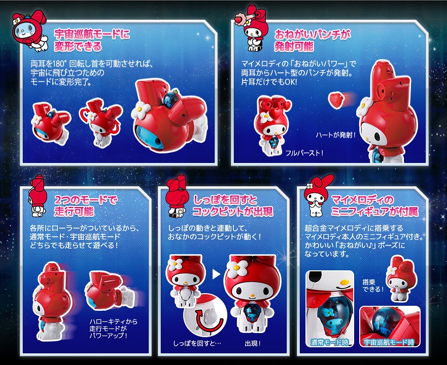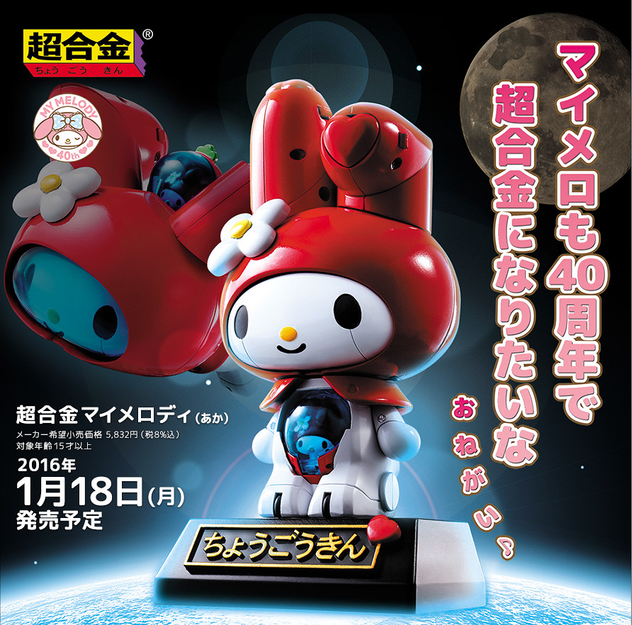 日本知名玩具品牌萬代玩具公司(BANDAI)旗下由魂ウェブ 所推出的超合金系列,預計將要於2016 年01 月18 日推出「美樂蒂」(My Melody)誕生40 週年的超合金作品。繼之前推出的「藍色版本Hello Kitty」與「紅色版本Hello Kitty」之後,這次將要推出三麗鷗明星家族中除了Hello Kitty 之外最紅的角色「美樂蒂」。