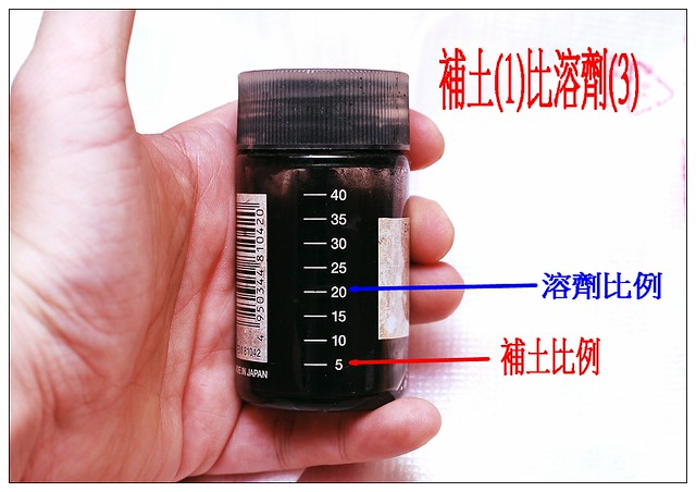 ▼補土和溶劑的比例基本上看個人習慣;我習慣使用1比3。如果大家不太會抓比例;建議大家可以去買這種有刻度的罐子,要稀釋顏料真的很方便。