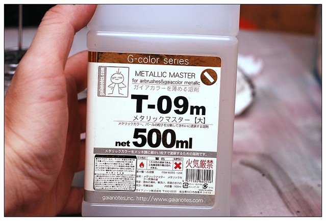 ▼金屬漆稀釋我使用蓋亞金屬漆專用的溶劑T-09m,幾年前還頗缺貨的,結果屯了快要10瓶,到現在還用不完(還有8瓶)Orz