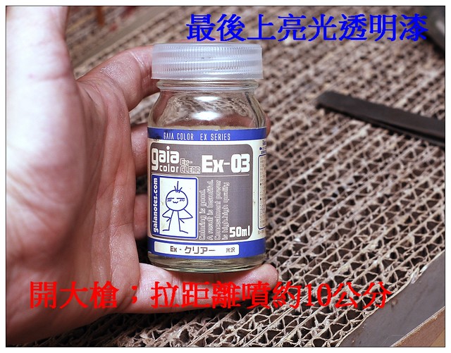 ▼第三層乾燥以後最後再上層亮光透明漆(蓋亞EX-03);上亮光透明漆的時候記得開大槍,距離拉遠,使用方法就和噴罐相同,差別在於一個是噴槍,一個是噴罐。