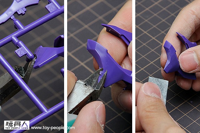 確認好零件狀況之後,請各位玩具人拿出你的模型專用斜口鉗,馬上開始製作吧!修剪模型第一式:兩段式剪裁,先從湯口上段部分剪下零件,再做第二段修剪。剩餘的部分就使用研磨砂紙打磨囉!