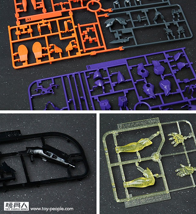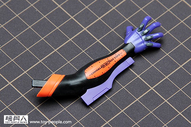 為了盡量貼近動畫中的機體質感,除了上圖EVA的外裝甲部分使用跟鋼彈模型相同的PS材質;左下圖雙手的部分也使用了PVC材質,讓手臂看起來更有肌肉的柔軟感;而右下“神之左手”也加入金色亮粉讓來凸顯PS材質的透明感。