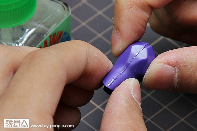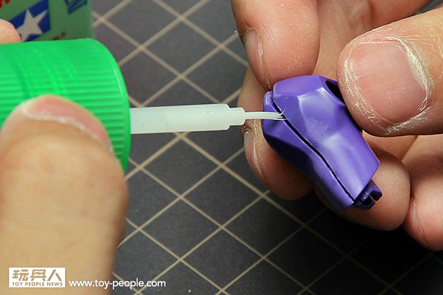 將組裝後的零件預留一個細縫,然後使用高流動模型膠水(俗稱綠蓋),沿著細縫滴入,平均滴滿即可!