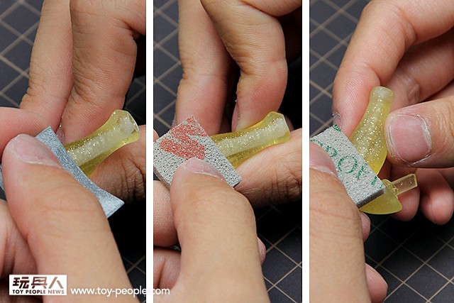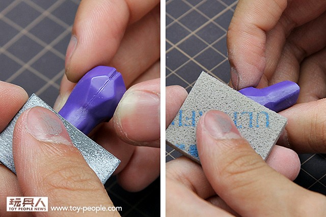 在進行研磨前,請等待至少24小時以上,零件內部的塑膠才會完全乾燥融合。研磨的方式請將研磨砂紙折成三段,將溢膠部分磨掉。因為EVA有許多曲面,所以我們再使用研磨海綿進行修飾
