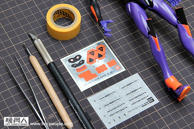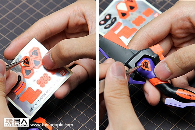 我們現在要貼的部分,初號機的號碼標示,使用了兩種顏色來表現。黏貼的方式也很簡單,請使用鑷子取下貼紙,位置對好後貼上即可。