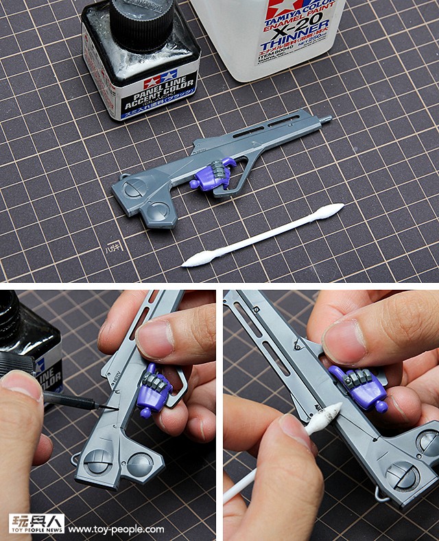 關於入墨線,重點就是要凸顯立體感。所以請將墨線液瓶蓋鎖緊後搖均勻,使用瓶蓋上的筆刷,針對細節如機械溝線,將墨線液點在溝槽中,墨線就會自行流動。墨線流出溝槽之外的部分,拿起棉花棒,沾取少許的X-20並且用紙巾把棉花棒吸到微乾的狀態。就可以對著畫出去的部分,直接擦掉。入墨線的程序就完成了。