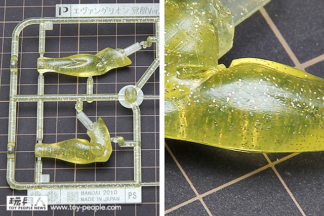 初號機 覺醒Ver. 最特別的地方就是這組透明的神之左手,又有伸直跟彎曲兩種型態,不過仔細一看,這左手上頭怎麼有那麼多細紋呢?原來是塑膠的收縮痕跡,那要怎樣才可以去除掉呢?