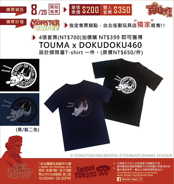 4張套票(NT$700)加價購NT$399即可獲得TOUMA x DOKUDOKU460 設計師限量TEE一件。(TEE原價NT$650/件)