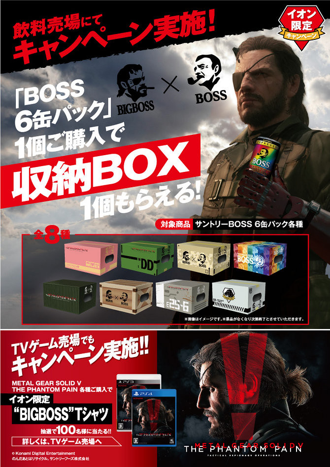 日本三得利公司知名的咖啡品牌「BOSS 咖啡」,與即將上市的電玩遊戲《潛龍諜影:幻痛》聯名合作,推出了上市宣傳的紀念活動。「BOSS 咖啡」× MGS的「BIG BOSS」聯名活動從2015年9月1日開始,只要在各大便利商店、量販店或賣場購買一手6 罐的BOSS 咖啡系列產品,就可獲得一款特殊的「BIGBOSS × BOSS 原創設計收納箱」,全部一共有8種不同款式,兌換完截止。