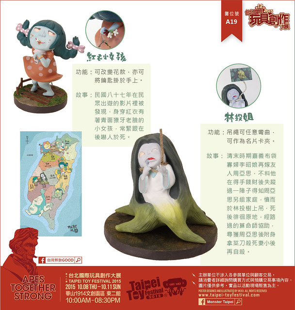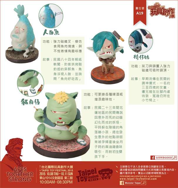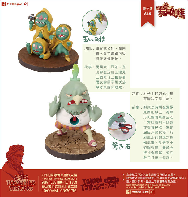 有鑑於民俗傳統逐漸沒落,本團隊特別以台灣民間傳說為主題,截取各時期鬼怪相關故事,並賦予角色新造型,設計出台灣特有妖怪公仔。每款妖獸公仔眼部均附著夜光漆,在昏暗環境下,眼睛可發出綠光效果,藉此營造出妖獸詭異嚇人之氣氛。