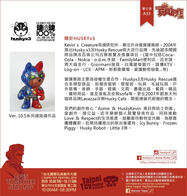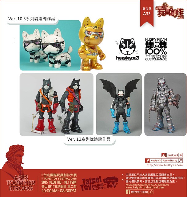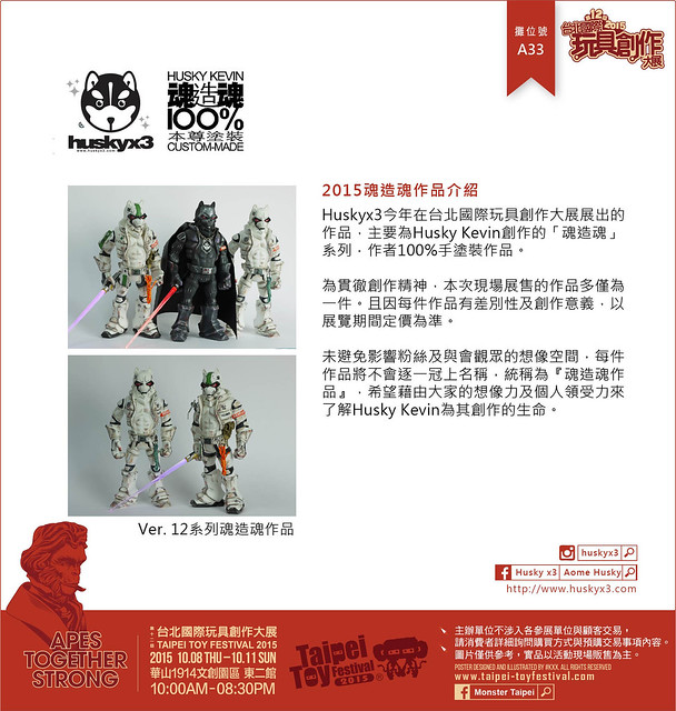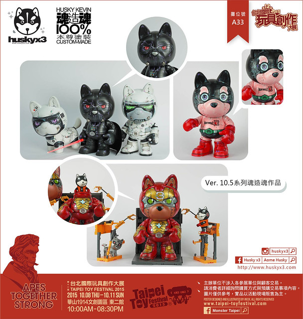 Husky x3今年在TTF展出的作品,主要為Husky Kevin創作的「魂造魂」系列‧作者100%手塗裝作品。為貫徹創作精神,本次現場展售的作品多僅為一件。且因每件作品有差別性及創作意義,以展覽期間現場訂價為準。