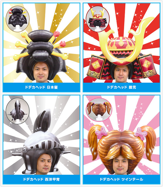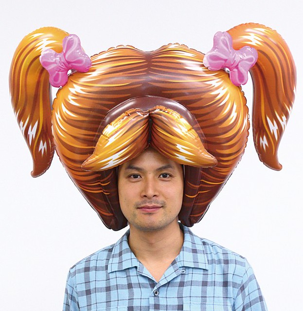 這一款作品雖然是由「Takara Tomy」的轉蛋事業部「T-ARTS」所推出,但並不是轉蛋玩具喔! 利用了充氣玩具的巧思與假髮創意結合,藉由充氣變大的假髮約有50~60公分大小,讓你展現出他人絕對無法錯過的矚目造型! 全套一共有四種款式,充滿男子漢氣息的東洋甲冑 & 西洋頭盔,以及充滿大和撫子風情的藝妓假髮,還有西洋蘿莉代表的雙馬尾造型~ 不論是哪一款,絕對讓你能夠HIGH翻全場啊~