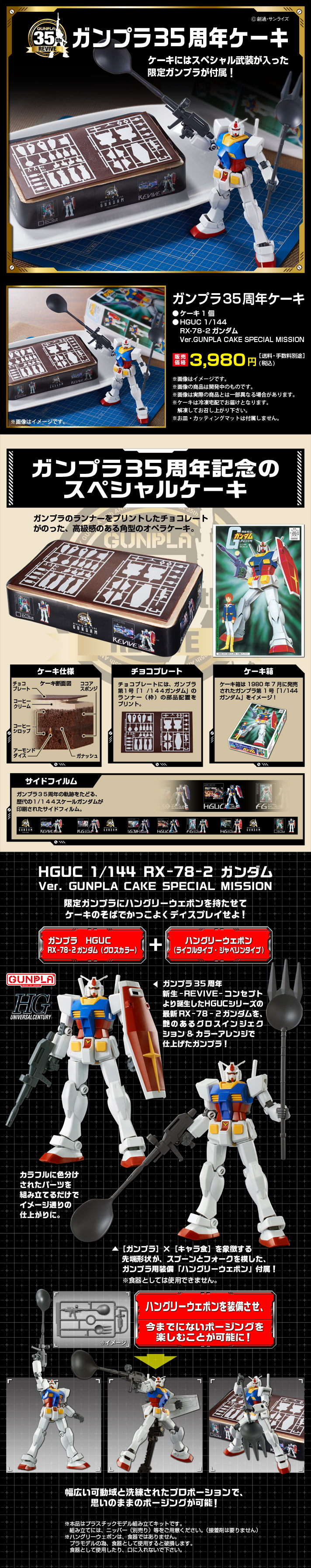 為了紀念鋼彈模型35週年,專門販售BANDAI 玩具限定商品的PREMIUM BANDAI,推出了這款特別企畫作品,將以1980年所發行的首款「1/144 比例鋼彈模型」的包裝設計成外盒,並使用印有歷代所發行的1/144 比例鋼彈RX-78-2 模型圖樣的邊條來維持蛋糕的形狀;蛋糕上方裝飾的巧克力片則是應有初代的「1/144 比例鋼彈模型」框架用以裝飾。