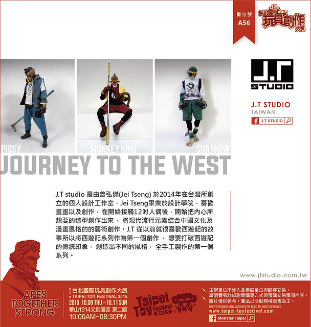 由台灣本土設計師Jei Tseng – 曾弘傑所成立的1/6 比例人偶品牌「J.T Studio」工作室,將會參與今年2015 年台北國際玩具創作大展的盛會,J.T Studio 工作室也預計會推出100 體的會場限定「美猴王W 植絨版本」的作品在A56 攤位販售。
