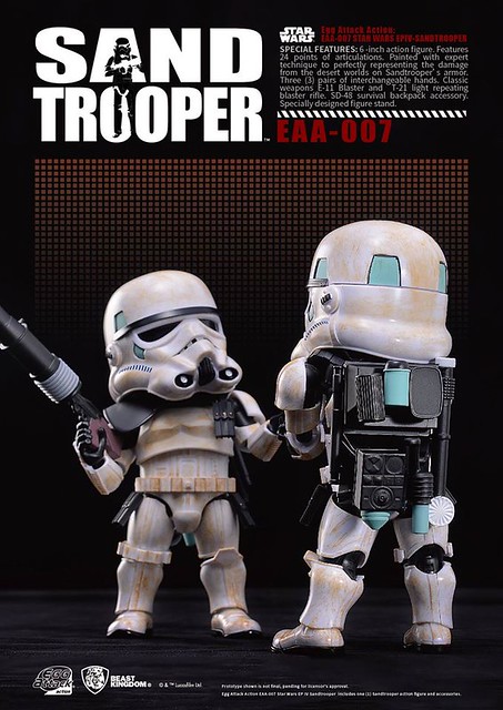 由野獸國玩具公司所推出最新的Egg Attack Action 系列可動公仔作品,繼宣佈推出全身高達24 處可動關節的「帝國暴風兵」之後,又將要推出另一款新作品:「帝國沙漠兵」(Sandtrooper)的作品。喜愛星際大戰的玩具人不要錯過啦!