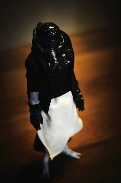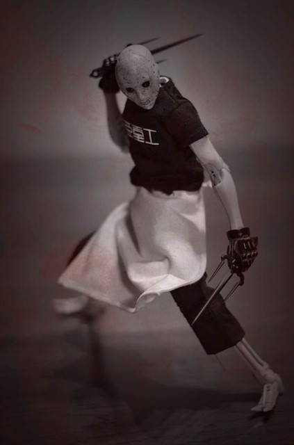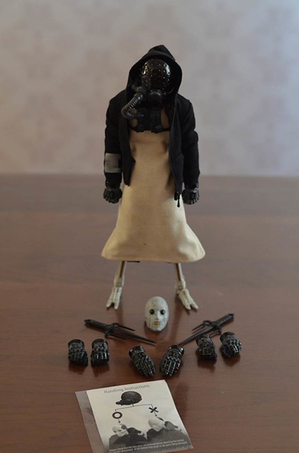 我手裡這款人偶的名字叫赤霧,作為対鹵獲転用體班“Anti CaRB Squad”一員,以紅色作為自己的標誌色以及雙叉作為自己的標誌武器。他的同伴還有,手拿長刀的青磁(美國會場)、雙節棍的黃混(泰國會場)、大砍刀的綠斑(日本會場)。他們的任務是負責抓獲逃走的鹵獲転用體。対鹵獲転用體班是專門為近距離作戰而設計的實驗體,他們的頭罩連接著頭蓋骨,頭罩打開後裡面還有一層保護膜。頭罩為機體提供:廣角視野、環境監測、以及能量供給,加上雙腿的高剛性構造,滿足了其長時間的近距離作戰要求。