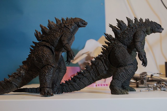 ▼ 哥吉拉則是分別用了好友阿亨噴過漆後提供的NECA(左)和S.H.M(右),NECA 的型好看,上色之後身上的紋理有光澤感比較漂亮,但SHM 可動稍微高一點,只有腳踏的特寫鏡頭是用SHM。
