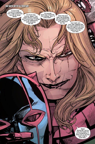 沒想到終極世界觀的征服者康,居然是來自於未來的隱形女蘇,她說到自己的時間線會被毀掉,是因為過去(指現在的終極世界觀)一場威脅造成,不過在鋼鐵人的策略下,這位蘇被傳送到更遙遠的未來,李德再次被關押。