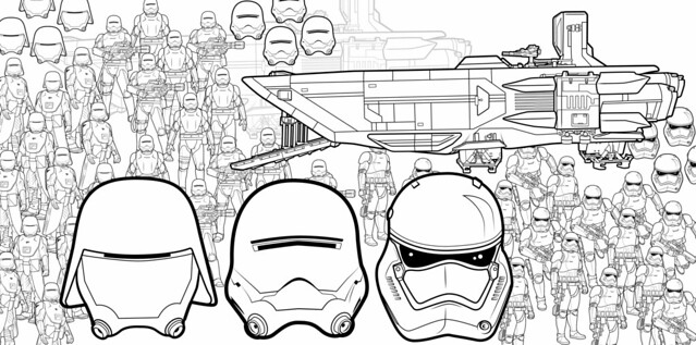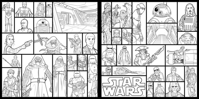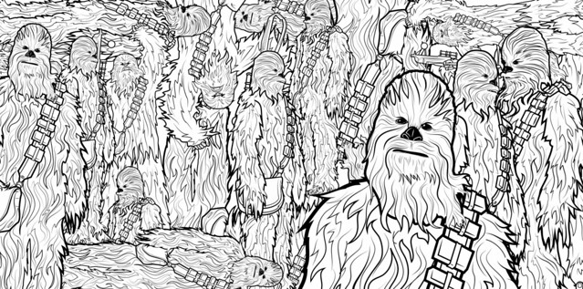 《大人的星際大戰著色本》將以《星際大戰七部曲:原力覺醒》為主題來繪製、設計,整本書一共有60頁各種不同內容所組成,收錄了各個在最新一集中登場的眾多角色,設計出了許多能夠讓人痛快上色、療癒心情的圖樣。比方說有跨頁、滿滿的武技族(秋巴卡的種族)畫面,也有大量白兵軍團(都是白的,這要我塗哪裡?),也有許多不同小插圖所構成的畫面,豐富的變化絕對能夠療癒星戰迷的你!
