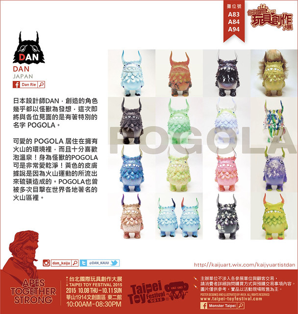 日本設計師DAN,創造的角色幾乎都以怪獸為發想,這次即將與各位見面的是有著特別的名字POGOLA。可愛的POGOLA居住在擁有火山的環境裡,而且十分喜歡泡溫泉!身為怪獸的POGOLA可是非常愛乾淨的!黃色的皮膚據說是因為火山運動流出來的硫磺造成的。POGOLA也曾被多次目擊在世界各地著名的火山區裡出沒。