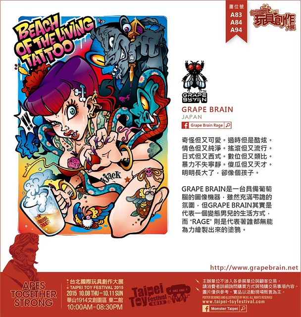 GRAPE BRAIN是一台具備葡萄腦的圖像機器,雖然充滿弔詭的氛圍,但GRAPE BRAIN其實是代表一個變態男兒的生活方式,而”RAGE”則是代表著誰都無能為力繪製出來的塗鴉。