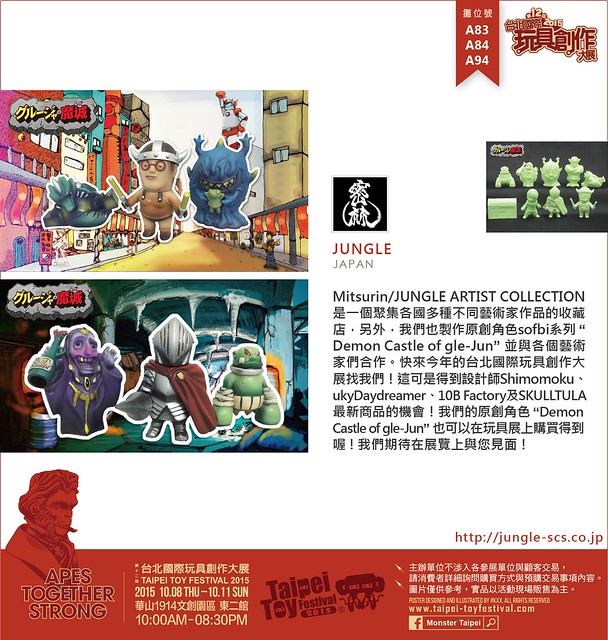 Mitsurin/ JUNGLE ARTIST COLLECTION是一個聚集各國多種不同藝術家作品的收藏店,另外,我們也製作原創角色sofbi系列“Demon Castle of gle-Jun”並與各個藝術家們合作。快來今年的台北國際玩具創作大展找我們!這可是得到設計師Shimomoku、ukyDaydreamer、10B Factory及SKULLTULA最新商品的機會!我們的原創角色“Demon Castle of gle-Jun”也可以在玩具展上購買得到喔!我們期待在展覽上與您見面!
