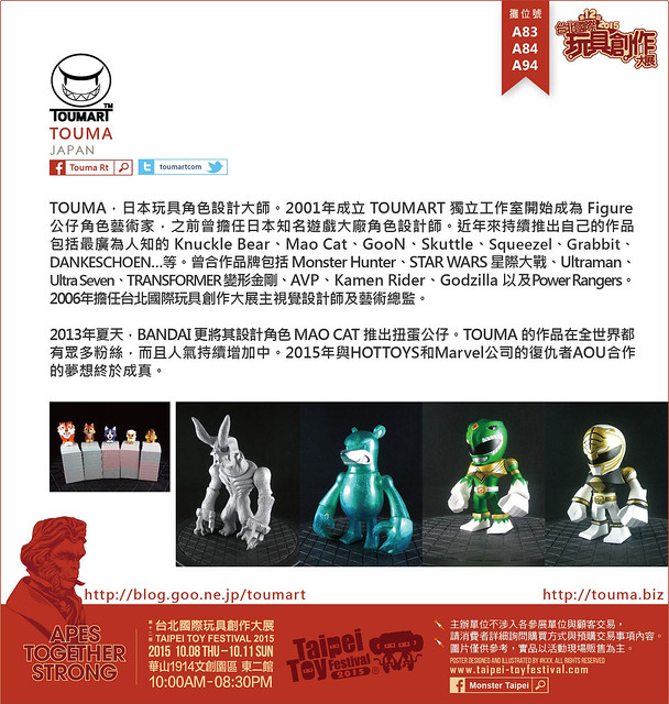 TOUMA,日本玩具角色設計大師。2001年成立TOUMART獨立工作室開始成為Figure公仔角色藝術家,之前曾擔任日本知名遊戲大廠角色設計師。近年來持續推出自己的作品包括最廣為人知的Knuckle Bear、Mao Cat、GooN、Skuttle、Squeezel、Grabbit、DANKESCHOEN…等。曾合作品牌包括MONSTER HUNTER、STAR WARS星際大戰、ULTRAMAN、ULTRA SEVEN、TRANS FORMER變形金剛、AVP、Kamen Rider、 GODZILLA以及POWER RANGERS。2006年擔任台北國際玩具創作大展主視覺設計師及藝術總監。