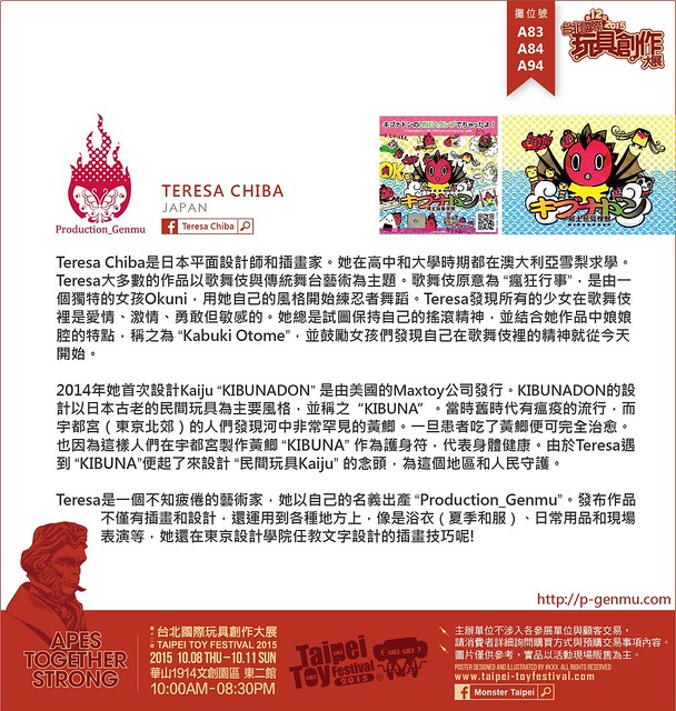Teresa Chiba是日本平面設計師和插畫家。她在高中和大學時期都在澳大利亞雪梨求學。Teresa大多數的作品以歌舞伎與傳統舞台藝術為主題。歌舞伎原意為”瘋狂行事”,是由一個獨特的女孩Okuni,用她自己的風格開始練忍者舞蹈。Teresa發現所有的少女在歌舞伎裡是愛情、激情、勇敢但敏感的。