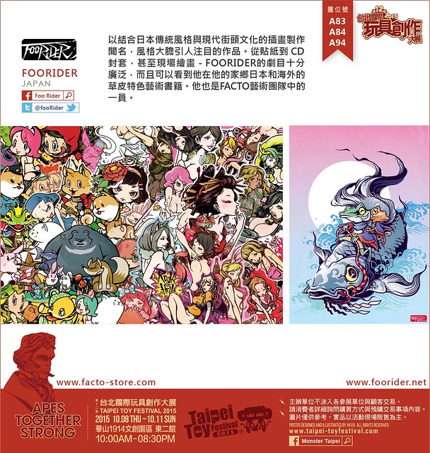 以結合日本傳統風格與現代的街頭文化的插畫製作聞名,風格大膽引人注目的作品。從貼紙到CD封套,甚至現場繪畫- FOORIDER的劇目十分廣泛,而且可以看到他在他的家鄉日本和海外的草皮特色藝術書籍。他也是FACTO藝術團隊中的一員。