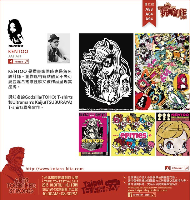 KENTOO是插畫家同時也是角色設計師。創作風格有點酷又不失可愛並混合搖滾性感女孩作品呈現其品牌。與知名的Godzilla(TOHO) T-shirts 和Ultraman’s Kaiju (TSUBURAYA) T-shirts聯名合作。