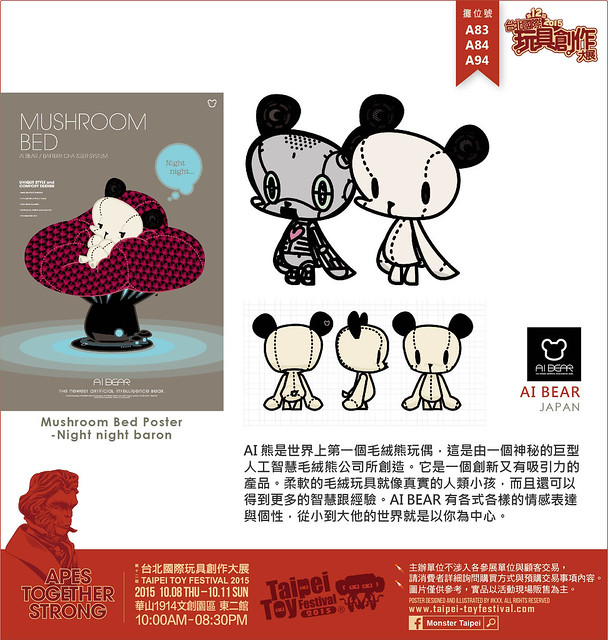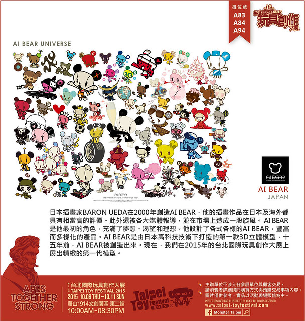 日本插畫家BARON UEDA在2000年創造AI BEAR,他的插畫作品在日本及海外都具有相當高的評價。此外還被各大媒體報導,並在市場上造成一股旋風。 AI BEAR是他最初的角色,充滿了夢想、渴望和理想。他設計了各式各樣的AI BEAR,豐富而多樣化的產品。AI BEAR是由日本高科技技術下打造的第一款3D立體模型,十五年前,AI BEAR被創造出來。現在,我們在2015年的台北國際玩具創作大展上展出精緻的第一代模型。