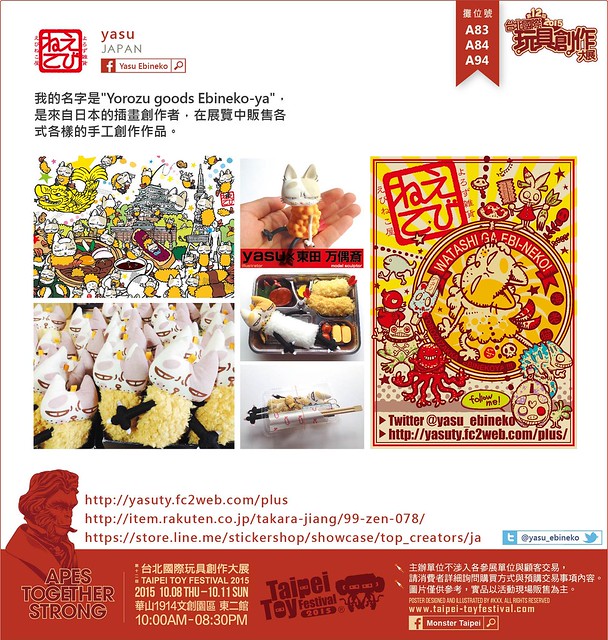我的名字是"Yorozu goods Ebineko-ya",是來自日本的插畫創作者,在展覽中販售各式各樣的手工創作作品。