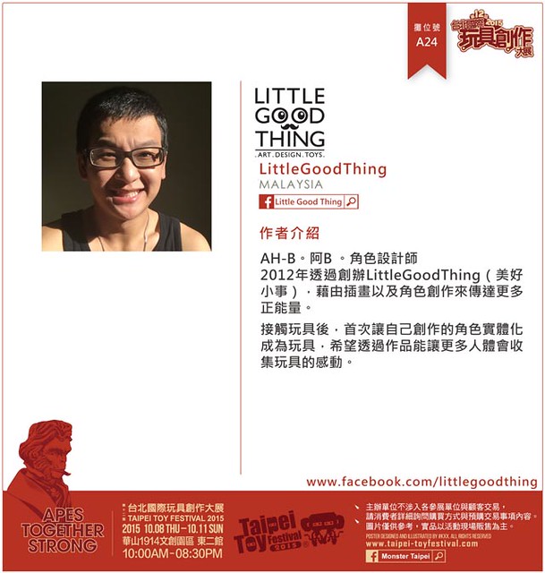 AH-B。阿B 。角色設計師,2012年透過創辦LittleGoodThing(美好小事),藉由插畫以及角色創作來傳達更多正能量。接觸玩具後,首次讓自己創作的角色實體化成為玩具,希望透過作品能讓更多人體會收集玩具的感動。