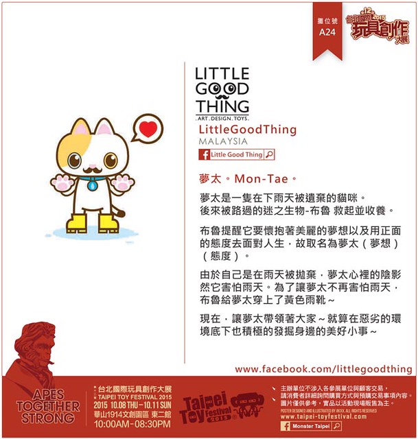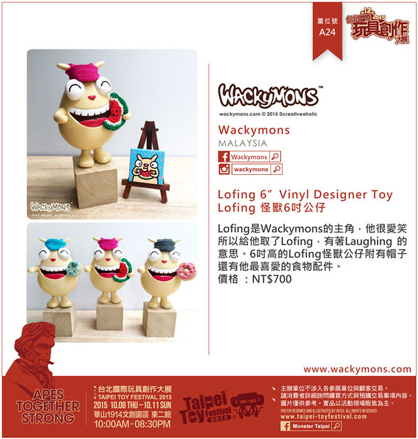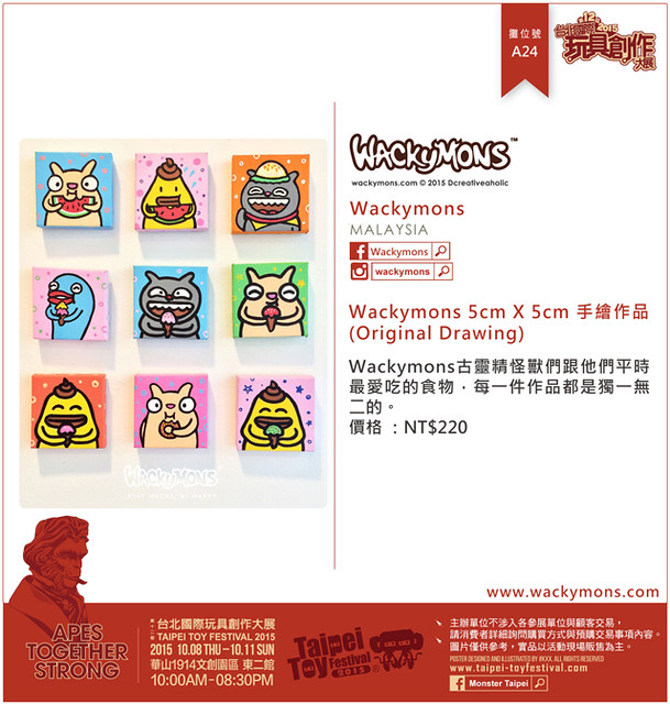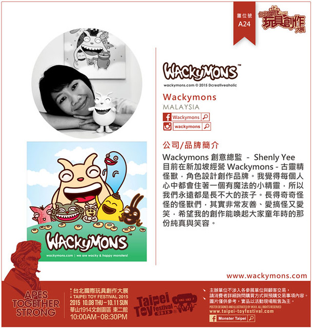 目前在新加坡經營 Wackymons 古靈精怪獸角色設計創作品牌。我覺得每個人心中都會住著一個有魔法的小精靈,所以我們永遠都是長不大的孩子。長得奇奇怪怪的怪獸們,其實非常友善、愛搞怪又愛笑,希望我的創作能喚起大家童年時的那份純真與笑容。