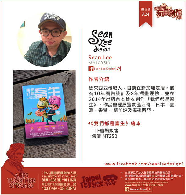 Sean Lee 馬來西亞檳城人,目前在新加坡定居。擁有十年廣告設計及八年插畫經驗,並在2014年出版首本繪本創作《我們都是畜生》。作品曾經展覽於墨西哥、日本、台灣、香港、新加坡及馬來西亞。