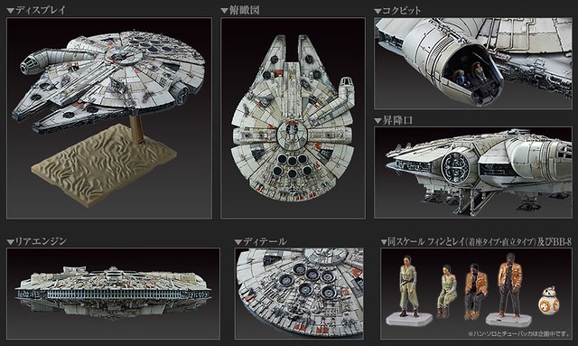 徹底以電影道具等等的資料來參考製作,重現電影當中的精彩造型與多處細節都相當精緻地表現出來,忠實地再現駕駛艙的內部結構,也附有此次原力覺醒當中新角色駕駛的站立、坐姿的兩種類姿勢,和新角色球型機械人BB-8等等,千年鷹號也有戰鬥、停泊不同狀態可以再現,停泊時也可以如劇中放置起落架和開啟下方進出艙門,附有此次沙漠主題的底座,喜歡《星際大戰》系列的玩具人千萬別錯過囉!